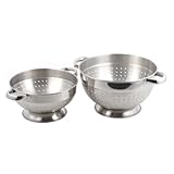 This beautiful pair of colanders are a great additions to your modern kitchen. They are handy for washing, draining, rinsing, and for keeping your fresh fruit and vegetables. Well-positioned oblong holes for quick drain. Function well in keeping what you want in and letting liquid out. Made of heavy-gauge 18/8 stainless steel. Versatile in handling hot or cold. Durable, food safe and easy to clean. Smaller colander is about 3 Quarts (12.25 inches L x 9.25 inches W x 4.75 inches H) and the larger one doubles to 6 Quarts (14 inches L x 10.75 inches W x 6.25 inches H) in volume. Brilliant finished band accenting the top and a brushed finish body. Each colander strainer set is shipped in a non-woven pouch. You'd be pleased in having them both in your kitchen. One year limited warranty. Read more