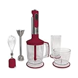 Enjoy the best features of a mixer, blender and food processor in the compact and versatile Wolfgang Puck stainless steel immersion blender. Perfect for chopping meat and vegetables and blending frozen drinks. The unit operates as a hand held blender and as a food chopper. It has a long, removable stainless steel mixing rod attached to the blade so you can immerse it in liquids like soup or milk. The food chopper has an attached bowl so you can cut up and dice vegetables. And because it comes equipped with variable speed, you're virtually assured of whipping up the fluffiest froths, pureeing the smoothest sauces, and chopping just right sized vegetables - all using the same, handy kitchen appliance. The multi-purpose blade chops, crushes, and mashes vegetables and fruit for baby food, fillings for cakes or soup and sauces. Make meals and drinks to impress your guests with recipes included in the book. Features: Stainless steel construction, 350-watt motor, 5-speed variable control, Stainless steel blending rod, Chopper bowls and beaker feature nonskid bases that double as lids. Read more